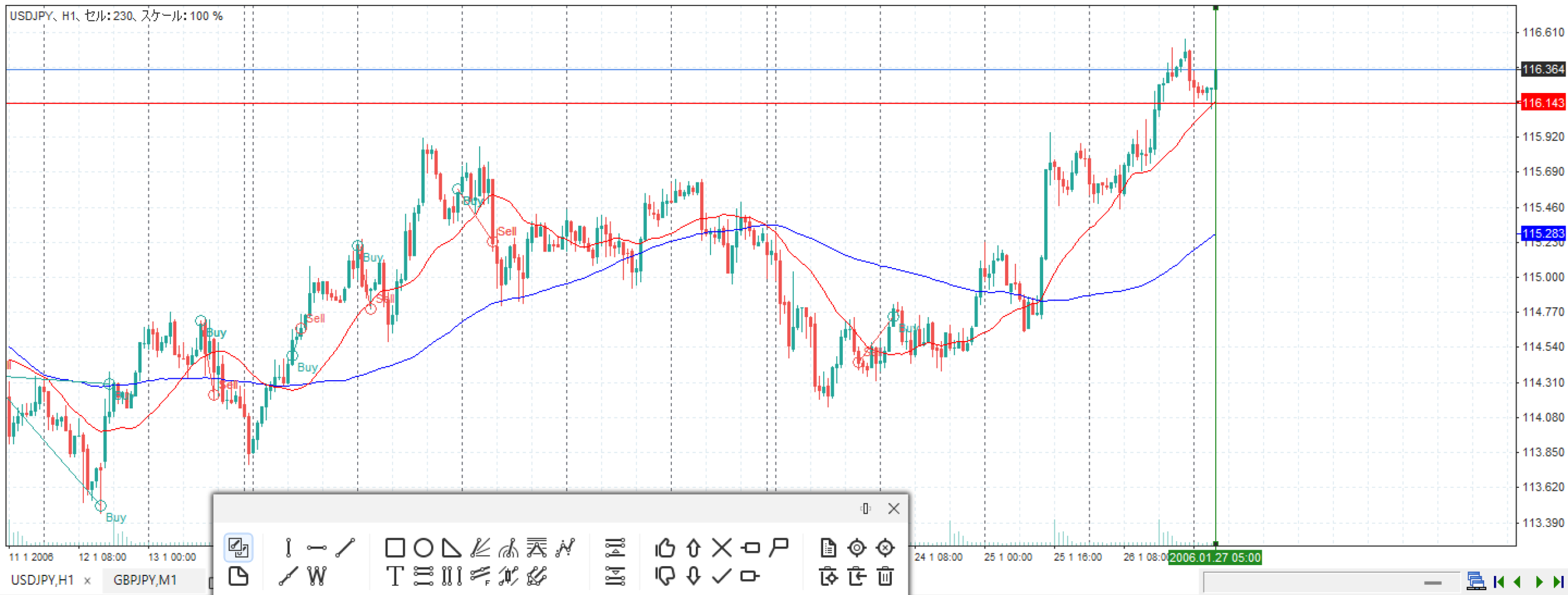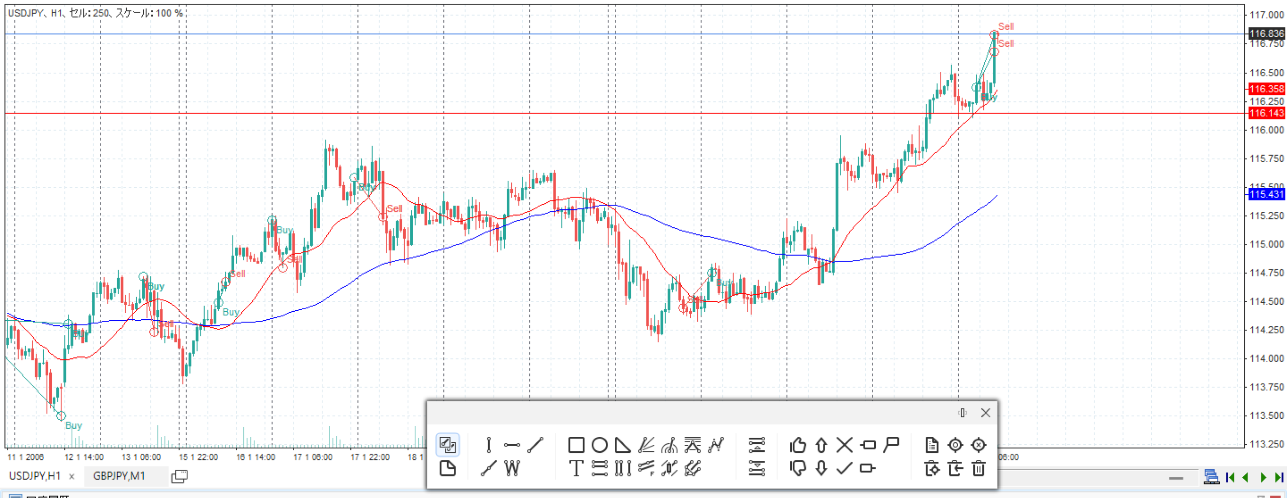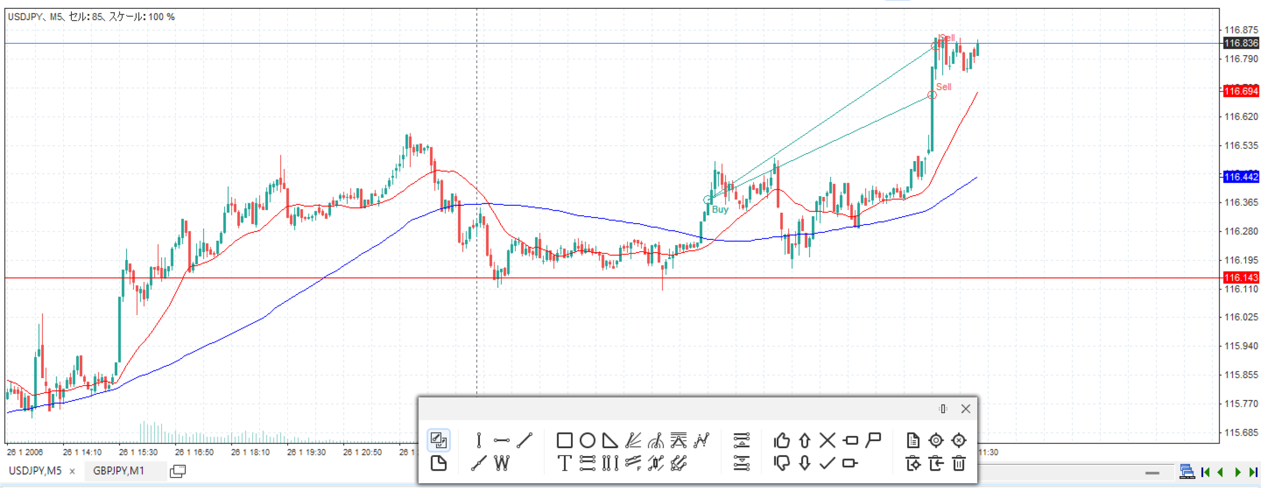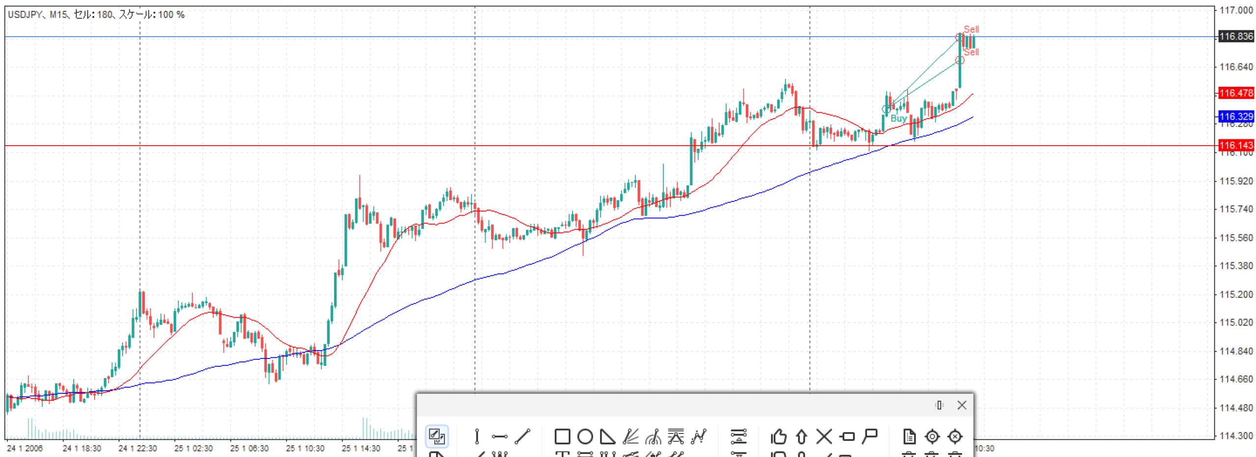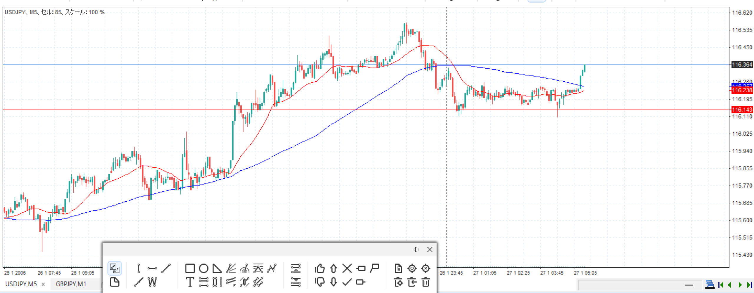 5分 15分と概ね同じ 15分と違うのは5分足は戻り高値が116.337にあり抜けたことで上昇に優位性が出た