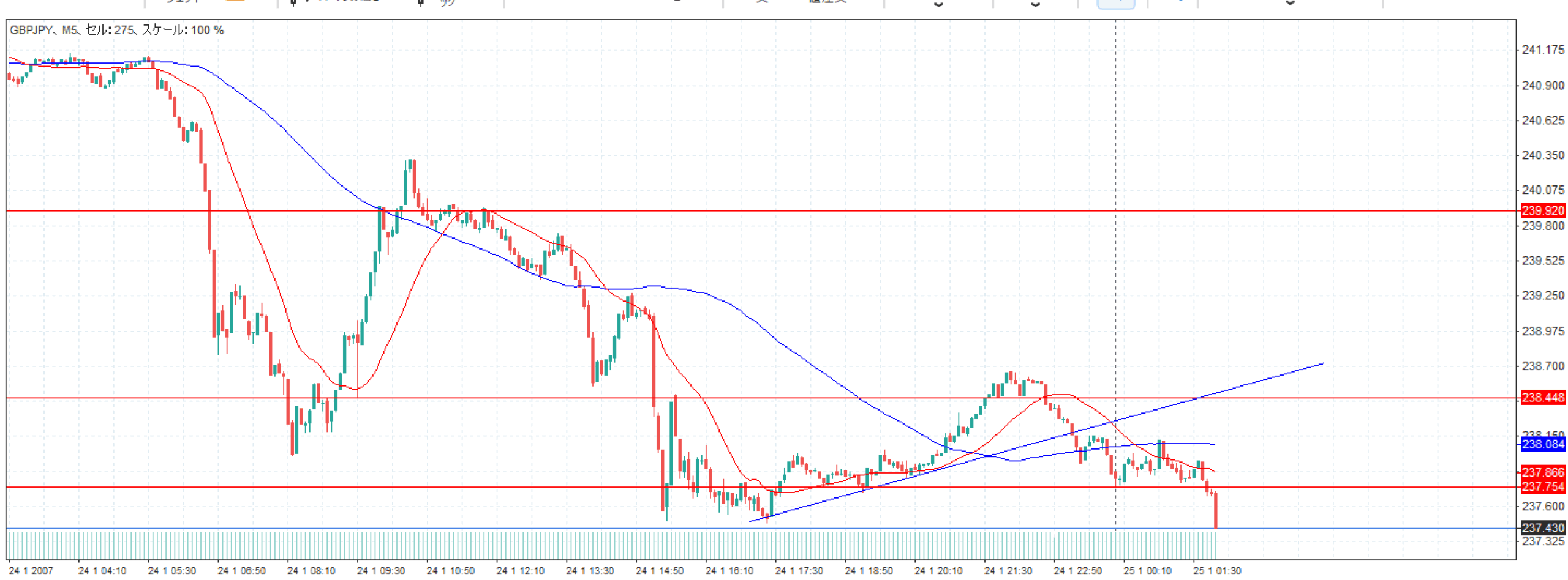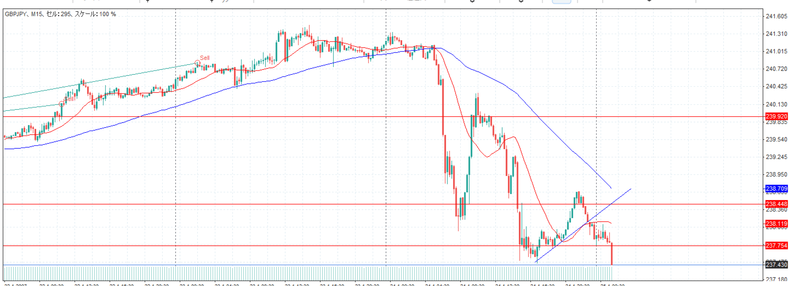 今回は15分と5分の上から下へのトレンド転換がエントリートリガーとなっていたため