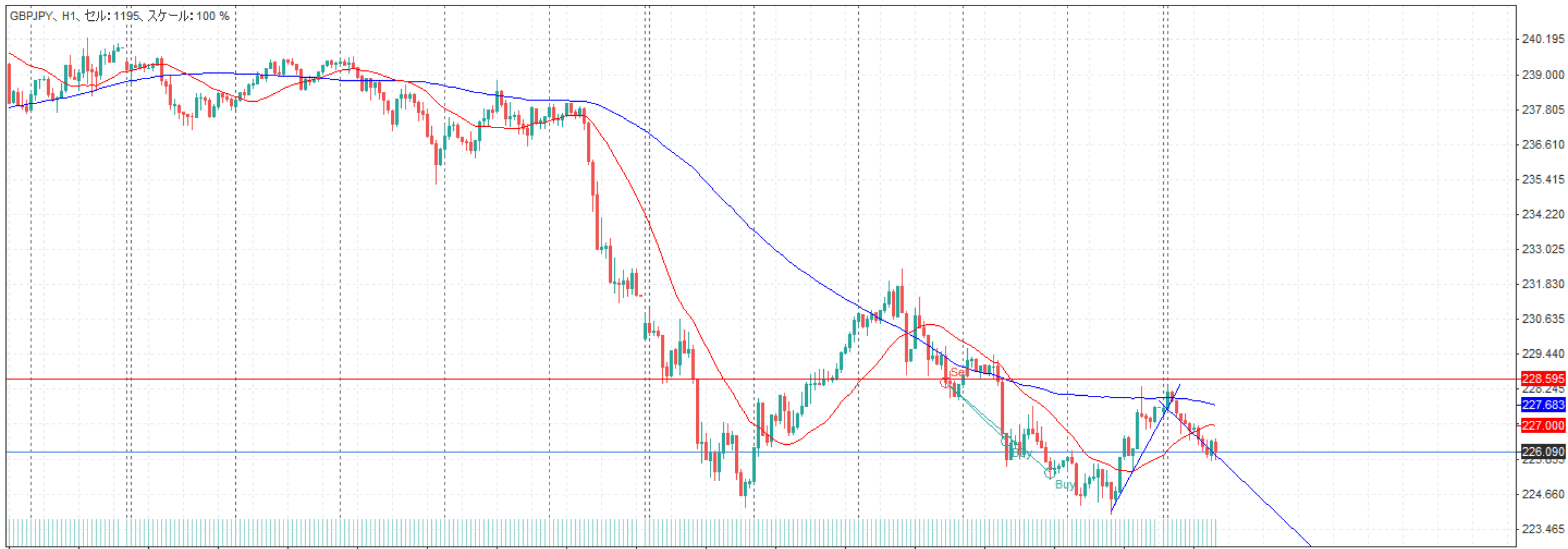 今回はエントリー足である4時間の下位足である1時間足がトレンド転換後の