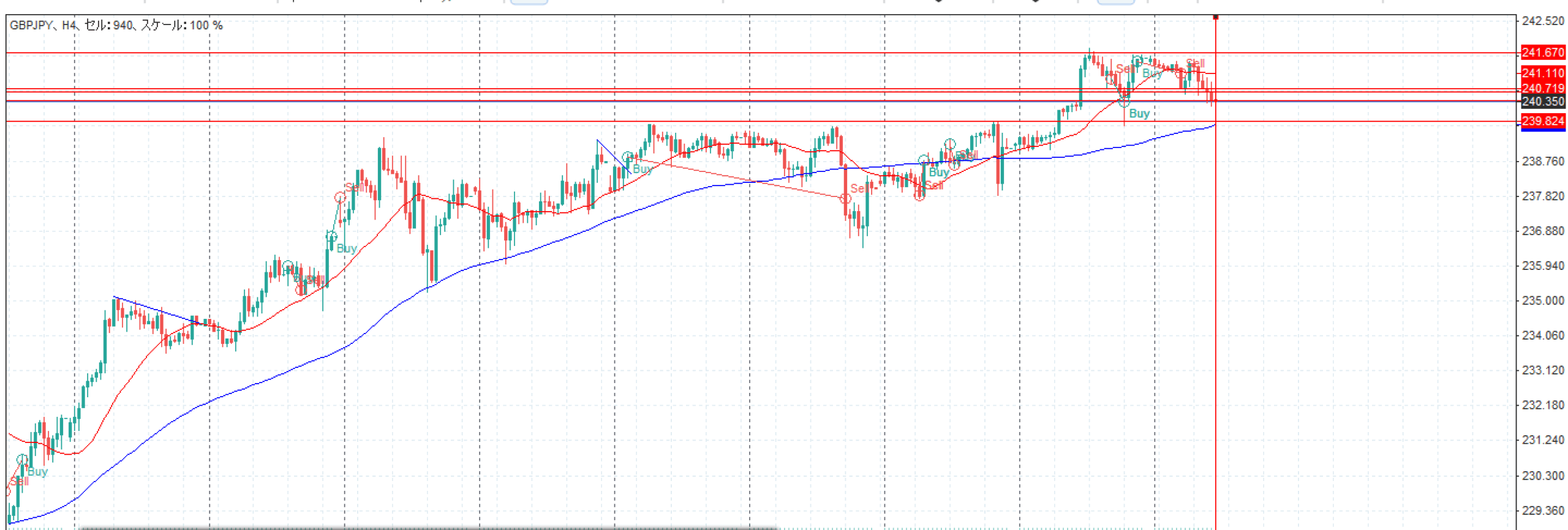 上位足である日足の21SMAが下にあることなどから売り目線で見る