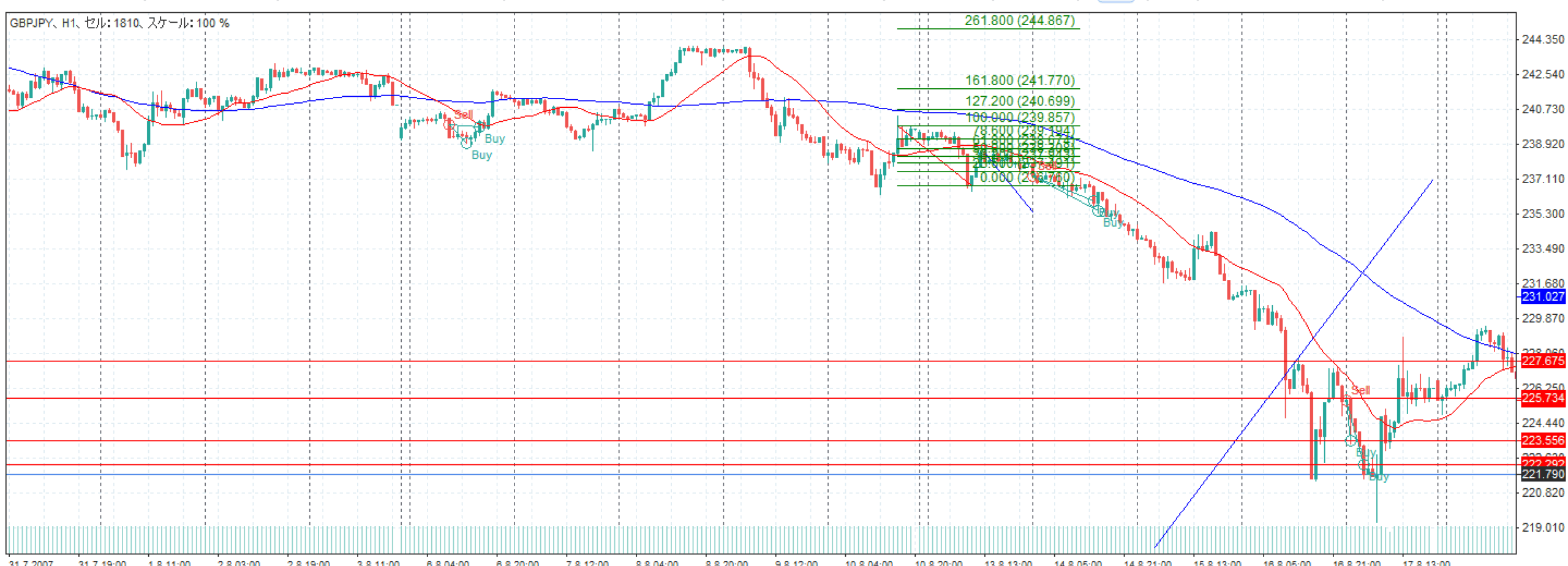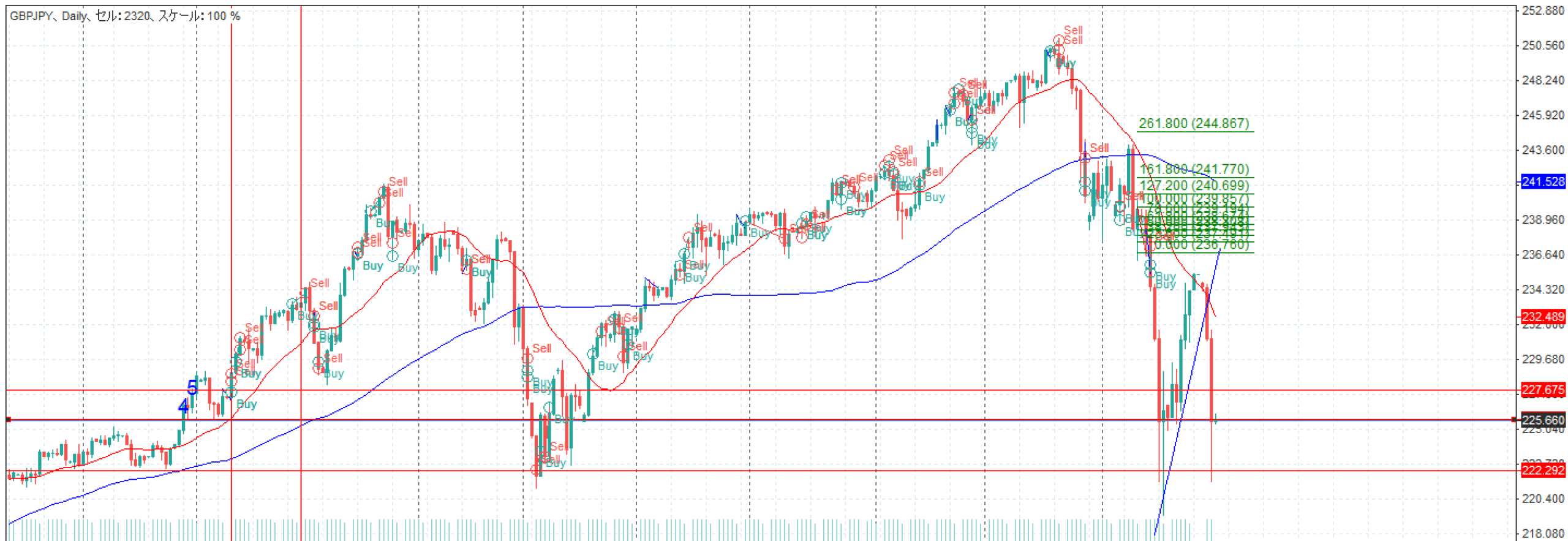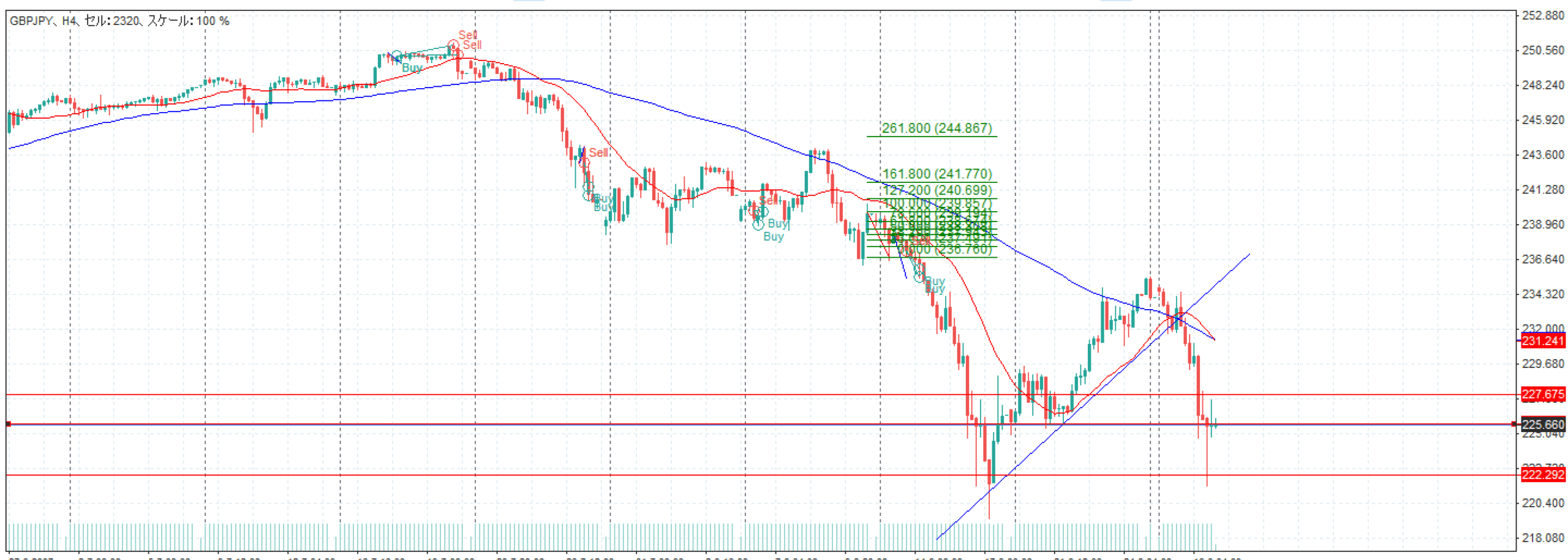 その後、安値をブレイクして225.660の水平線でレジスタンスされている
